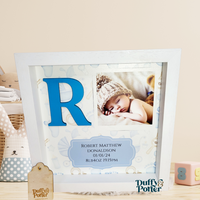 This frame really is special and if I may, the pictures don't do it justice. The piece is set on a grey/pink background with a pearlescent finish, it is so subtle it only acts to enhance the piece without taking away for the centre focus. This piece is personalised with names and any other details you would like to include. The focal point of the piece is the picture of the precious new arrival, with a wooden Letter representing the first letter of Babys first name, there is soace at the bottom also to record baby birth details or a lovely message/prayer or blessing.