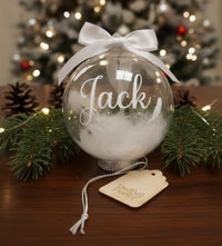 This piece is 10cm glass finished off with feathers in the bauble to create a floating effect, the name of your loved one is also inclided with two feathers either side of it on the outside of the bauble