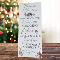Celebrate the joy and warmth of the festive season with the Duffy & Porter Christmas Moments Sign. Measuring approximately 35x14cm, this charming sign is designed to capture the essence of Christmas with delightful references to hot chocolate, winter walks, sledging, woolly jumpers, snow days, and Christmas markets.