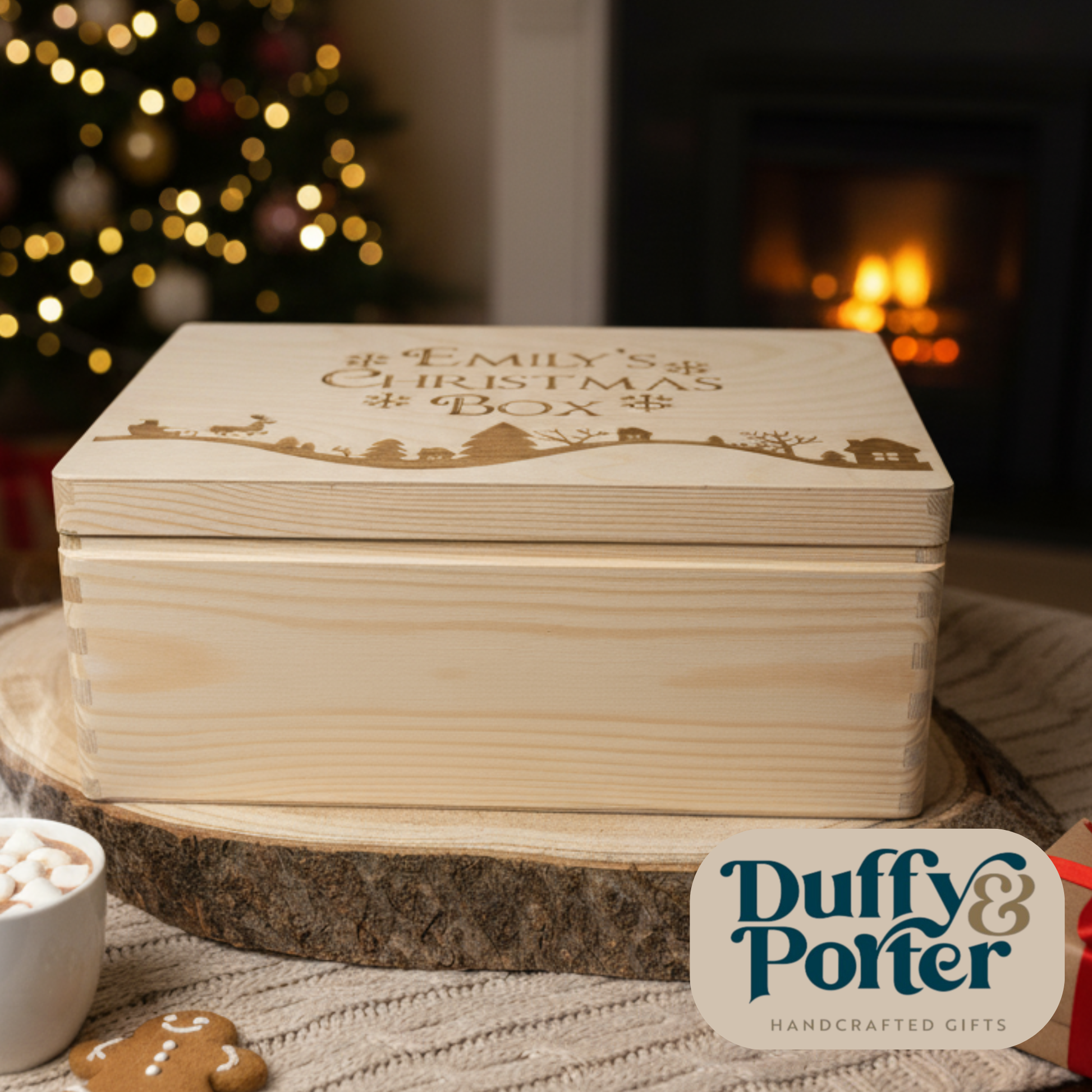 Step into the wonder of Christmas Eve with a timeless keepsake that’s as pure and magical as the season itself. The Duffy & Porter Christmas Eve Box—crafted from solid wood and left in its natural, unpainted beauty—is a celebration of simplicity, tradition, and heartfelt detail.