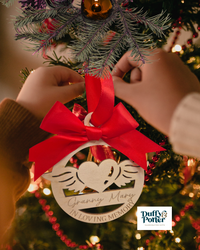 Keep cherished memories close this Christmas with our Angel Wings Memorial Bauble, a beautifully crafted tribute made in Ireland by Duffy and Porter. Featuring a delicate heart at the centre with angel wings rising from it, this ornament offers a gentle reminder of love that never fades.