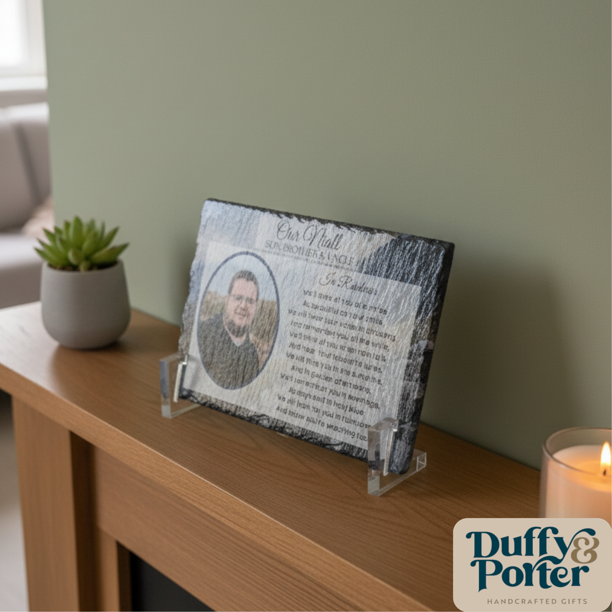 This poem really has a beautiful sentiment that our loved ones are all around. We, at Duffy and Porter decided to create a piece with it that can be displayed proudly in the home or at their resting place.