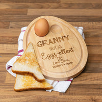 Our breakfast boards are a lovely solid piece with a moat around the edge of it to catch any stray liquids or crumbs, it has two divots to hold eggs upright