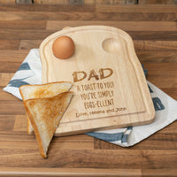 Our breakfast boards are a lovely solid piece with a moat around the edge of it to catch any stray liquids or crumbs, it has two divots to hold eggs upright