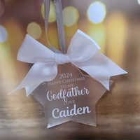 Made from high-quality 3mm acrylic, this star catches the light beautifully and is built to last for many Christmases to come. Personalised with the godchilds name, the year, and a message from the godchild, it’s a thoughtful way to honour a cherished relationship.
