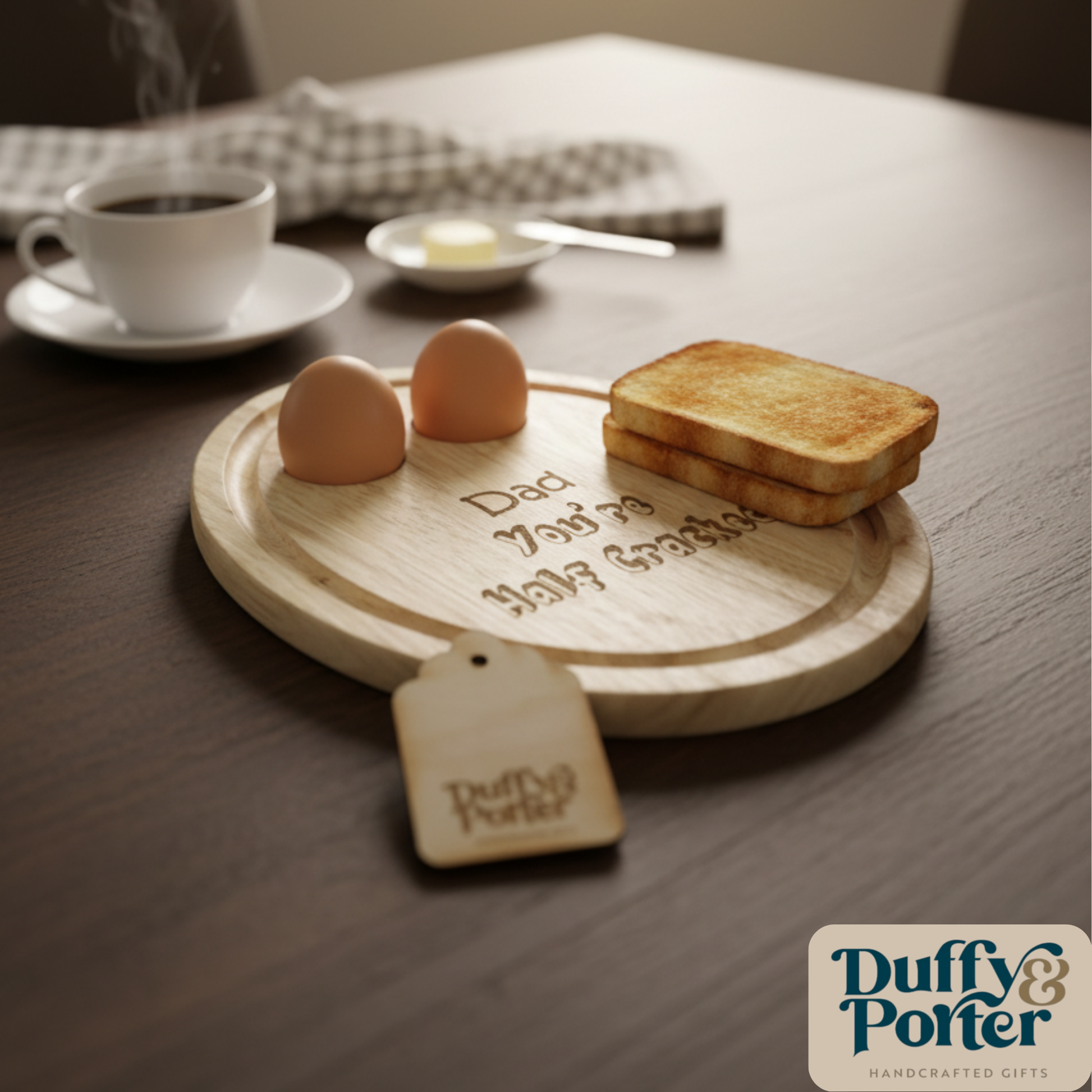 Our breakfast boards are a lovely solid piece with a moat around the edge of it to catch any stray liquids or crumbs, it has two divots to hold eggs upright