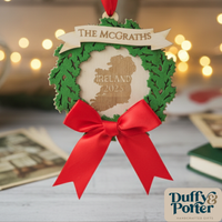 This Christmas, send a hug from home. Our festive shamrock decoration is a joyful blend of Irish heritage and holiday cheer — handcrafted in Bunclody and personalised with your chosen name or family name, topped with a playful Santa hat for seasonal sparkle.