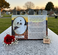 Measuring 30x20cm, this memorial slate is personalised to reflect your pet’s unique story. It features your favourite photo of your beloved companion alongside their name, ensuring the tribute is as individual as they were. The design is complemented by a serene background image of golden fields, symbolising the place where your pet now runs free—a visual connection to Maria’s beautifully engraved poem: