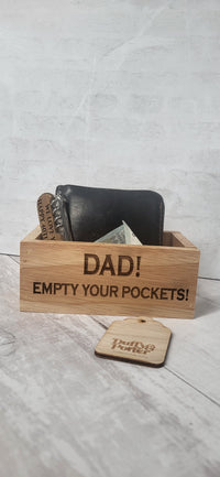 Say goodbye to the days of coins clinking in the washing machine and hello to a new era of organisation. With the **Dad's Pocket Pal**, his wallet, phone, and keys will have a snug retreat every night. And the best part? You can make it uniquely his with a choice of custom engraving – be it his name, a cheeky message, or simply 'Dad's Stuff'.