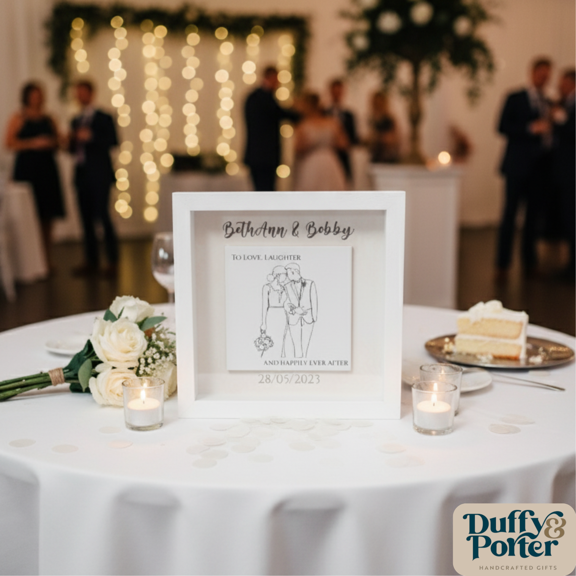 This frame really is special and if I may, the pictures don't do it justice. The piece is set on a wooden backdrop with a damask effect background with a pearlescent finish, it is so subtle it only acts to enhance the piece without taking away for the centre focus. This wooden piece is personalised with names and any other details you would like to include. The focal point of the piece is the ceramic tile carefully mounted to take centre stage. The tile is printed with the featured image depicting a special moment in time. It is created in house making a truly unique piece and a gift that will always be rememebered