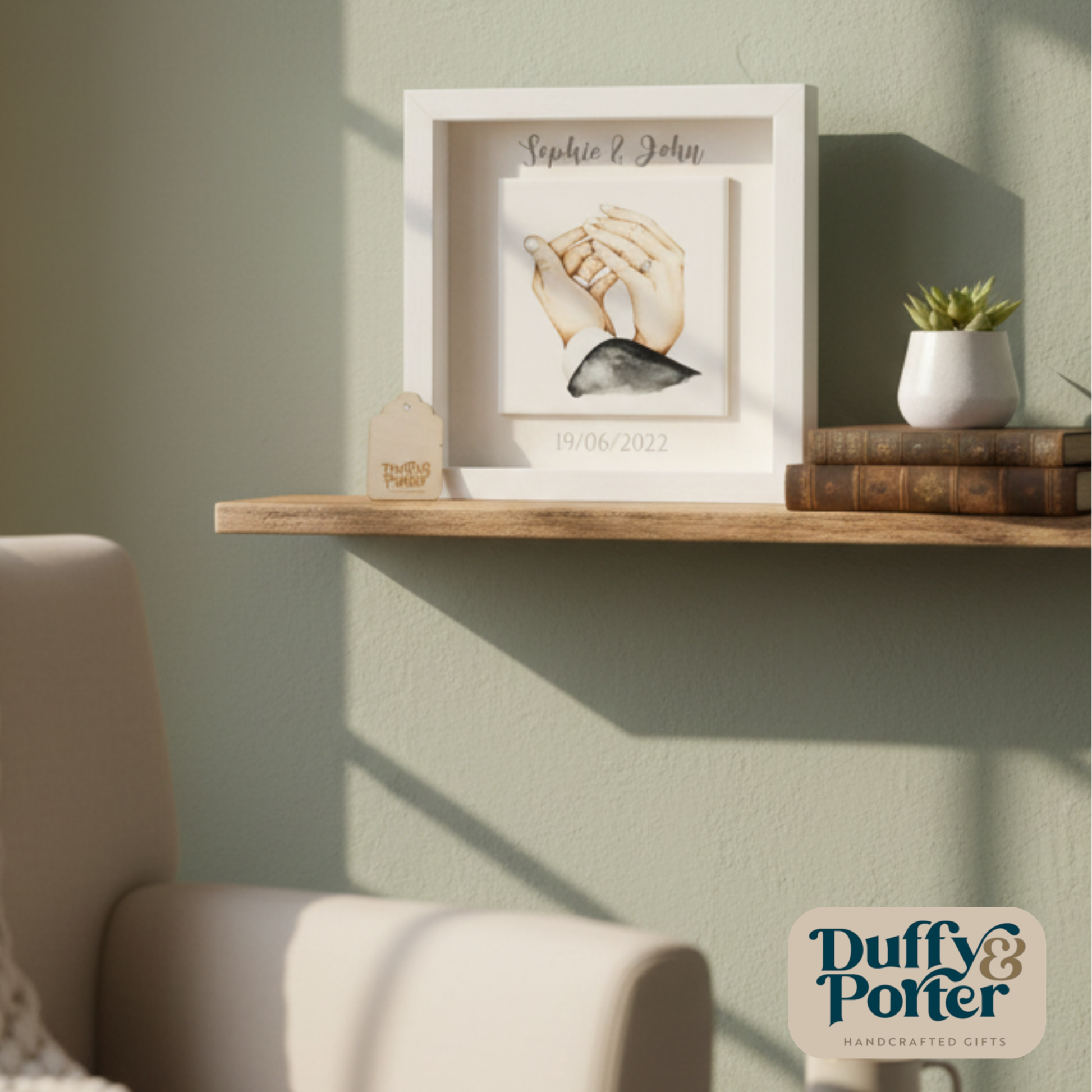 This frame really is special and if I may, the pictures don't do it justice. The piece is set on a wooden backdrop with a damask effect background with a pearlescent finish, it is so subtle it only acts to enhance the piece without taking away for the centre focus. This wooden piece is personalised with names and any other details you would like to include. The focal point of the piece is the ceramic tile carefully mounted to take centre stage. The tile is printed with the featured image depicting a special moment in time. It is created in house making a truly unique piece and a gift that will always be rememebered
