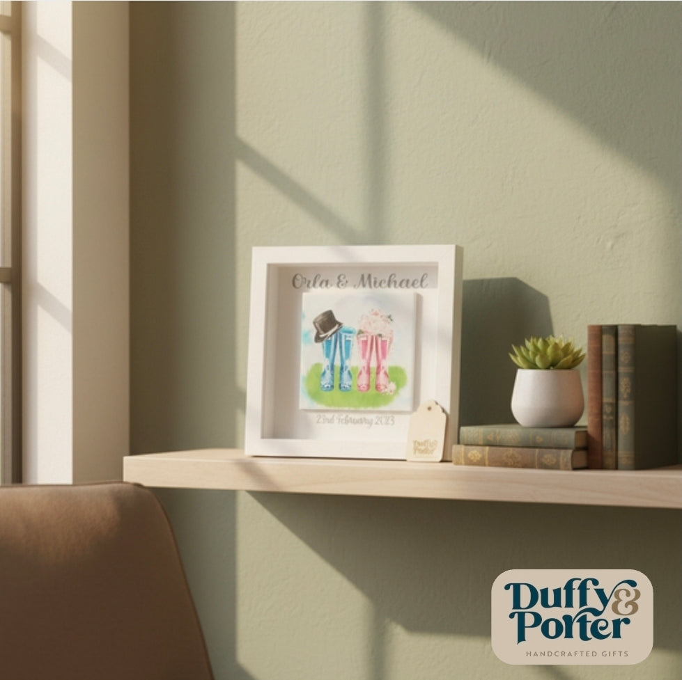 Our frame collection is no different, they are created in house and mounted in Irish made solid wood frames. They are encased in a Glass front. Measuring approx 235x235mm they are ideal for hanging or sitting simply on a shelf.