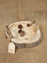 Measuring c 30cm wide and approx 5cm deep. As this is a natural product bariations in woodgrain and bark cover as well as shape will occur